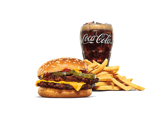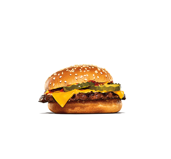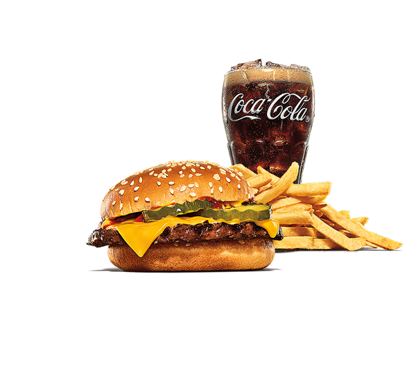 Hamburgare av 100 % nötkött med ost och ketchup. I ett King JR meal ingår valfri liten dryck, litet tillbehör samt bok.