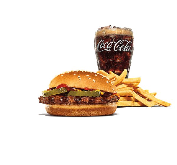Hamburgare av 100 % nötkött med enbart ketchup. I ett King JR meal ingår valfri liten dryck, litet tillbehör samt bok.