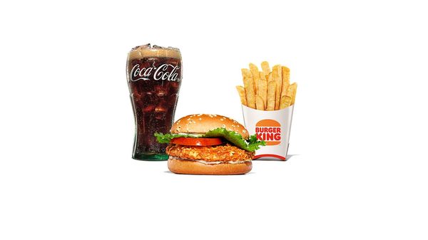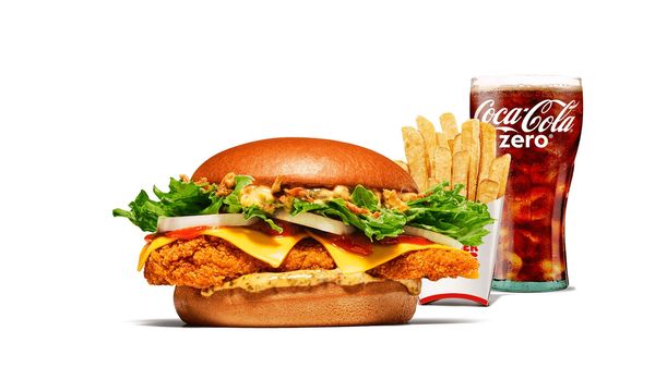 En friterad kycklingburgare med krispig sallad, tomat och chili cheese-sås. Serveras med valfri dryck och tillbehör.