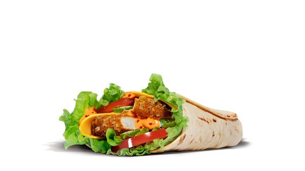 Krispig kyckling toppad med kryddig Andalouse-sås, jalapeños, cheddar och färsk sallad – allt insvept i en mjuk tortilla!