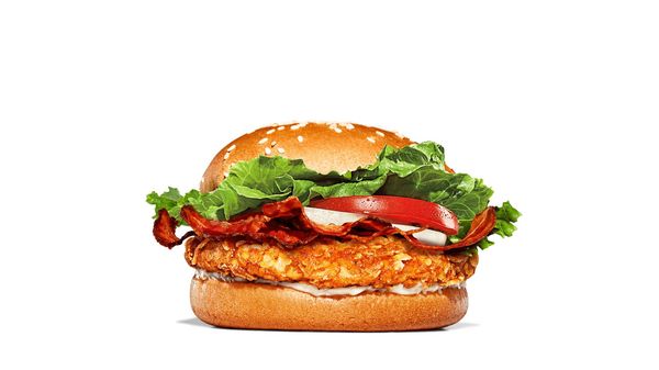 En extra lång burgare med saftig, panerad kycklingfilé, ost, bacon, färsk sallad och majonnäs.