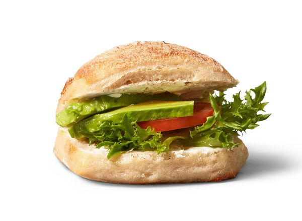 Vetebagel med vegetabiliskt pålägg, avokado, picklad rödlök och ruccola.