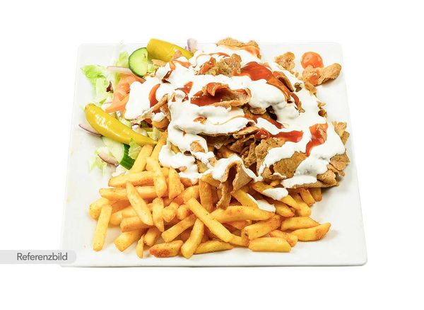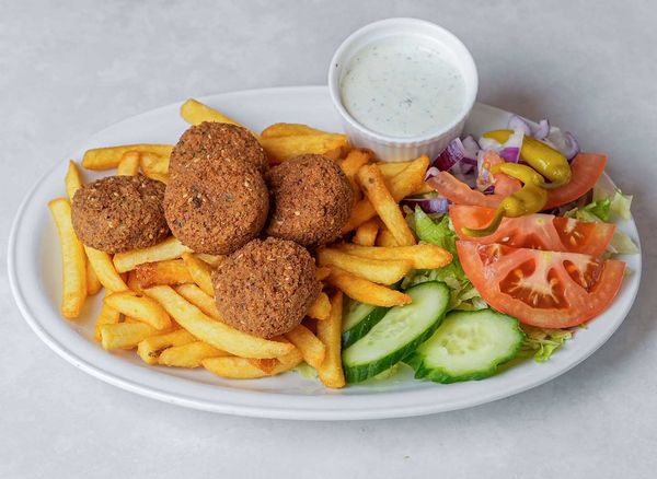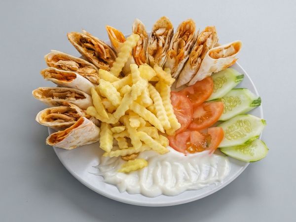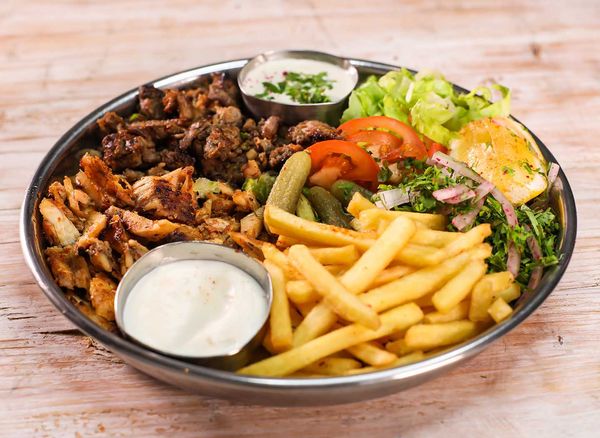 4 kebab skewers, 4 chicken skewers, 4 lamb skewers, 2 grilled kubbeh, grilled fish, half chicken with grilled vegetables, bread, fatoosh salad, hummus, muhammara, tzatziki and baba ghanoush.