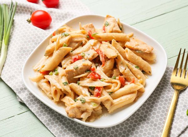 Kryddig kyckling med pasta, grönsaker och en krämig sås. En smakrik måltid.