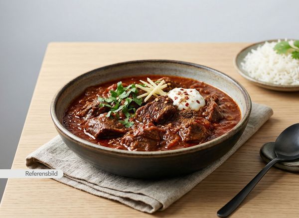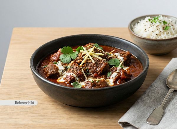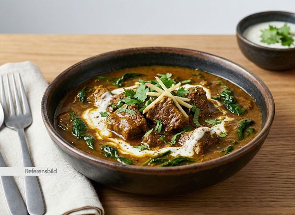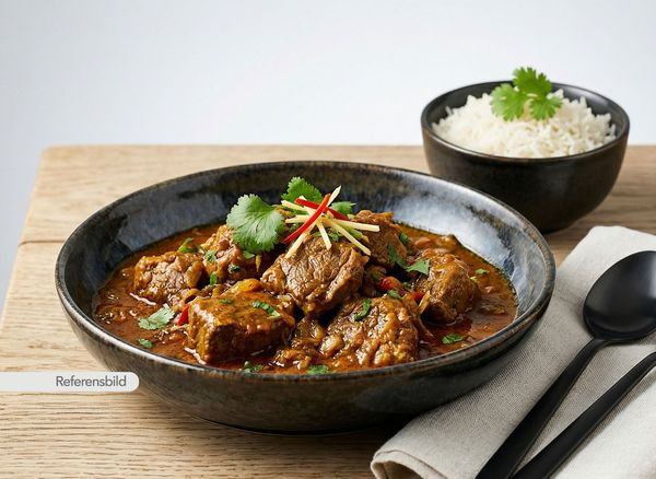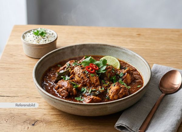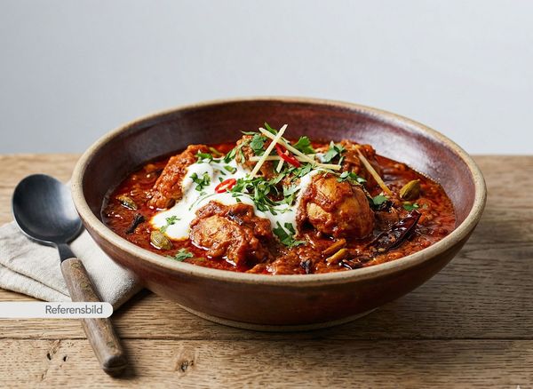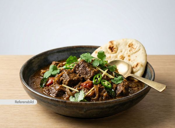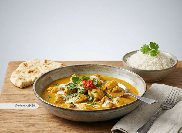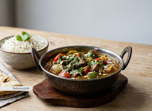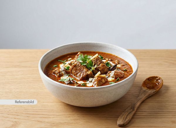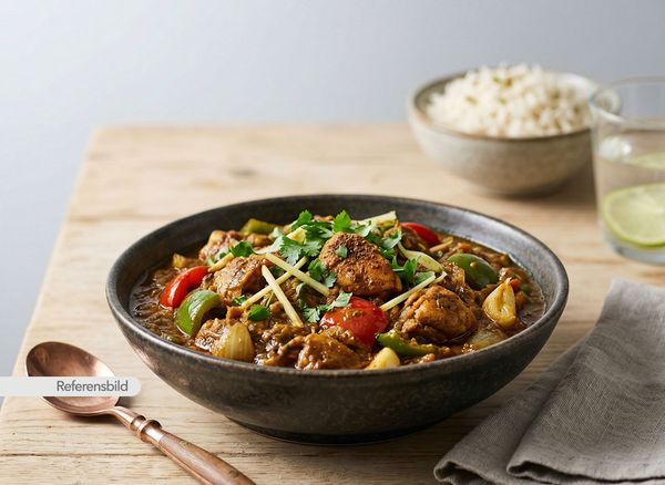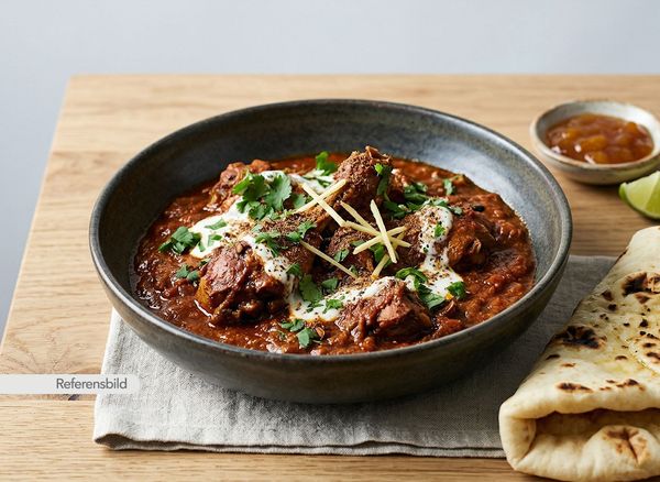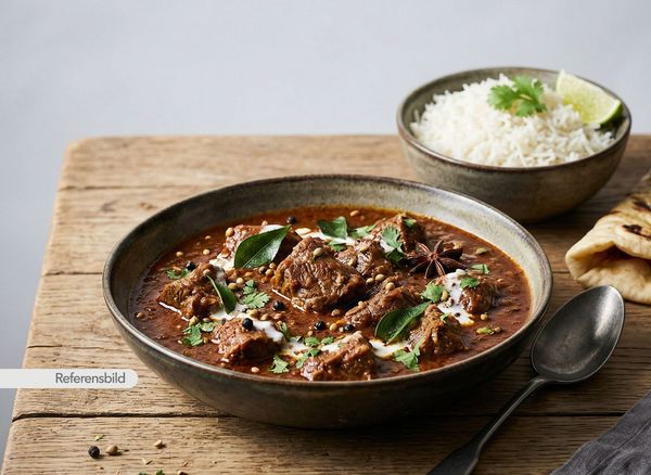 Stark. Serveras med gryta tillagad med yoghurt, kokosmjölk, madras curry masala, färsk koriander, vitlök, ingefära, tamarind och kryddblandning