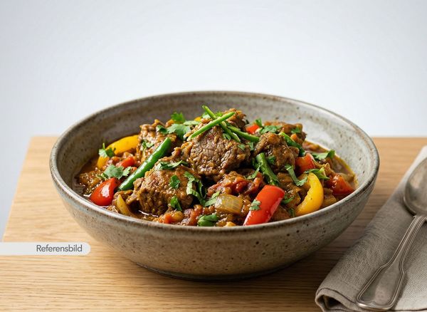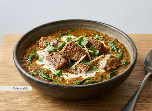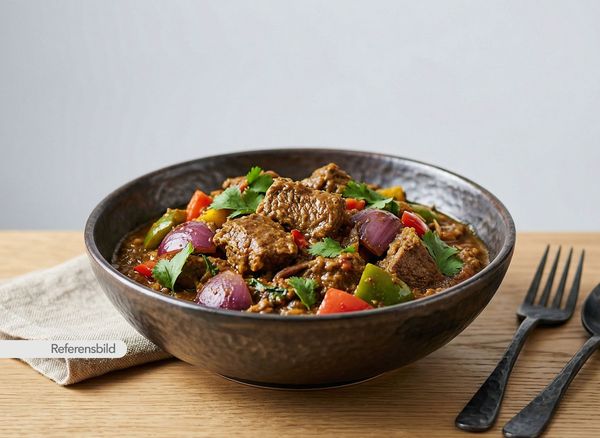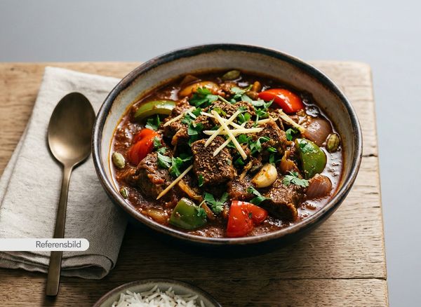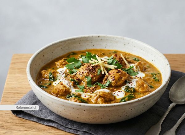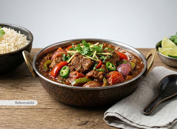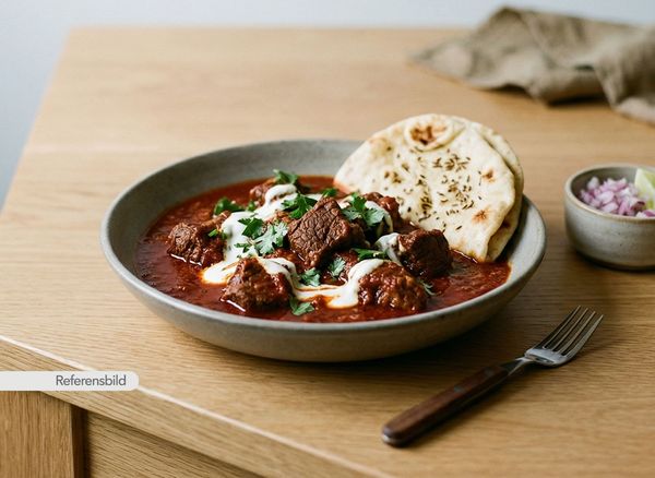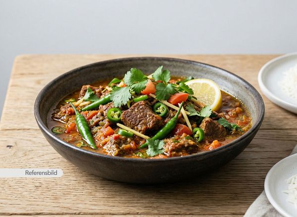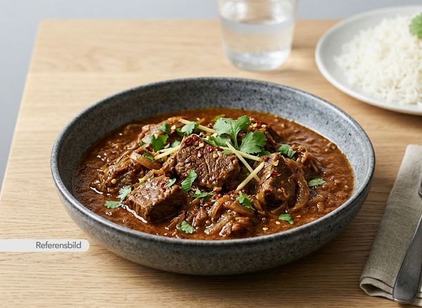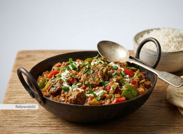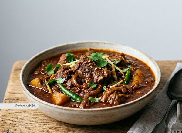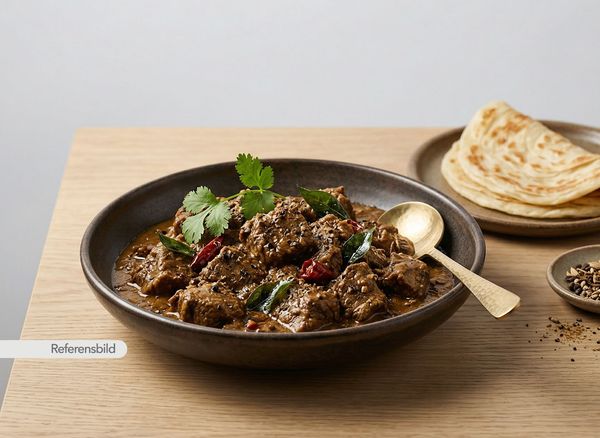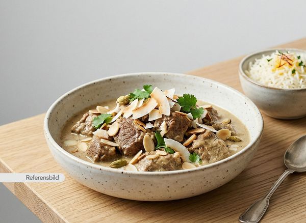 Stark. Serveras med gryta tillagad med yoghurt, kokosmjölk, madras curry masala, färsk koriander, vitlök, ingefära, tamarind och kryddblandning