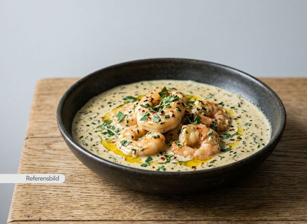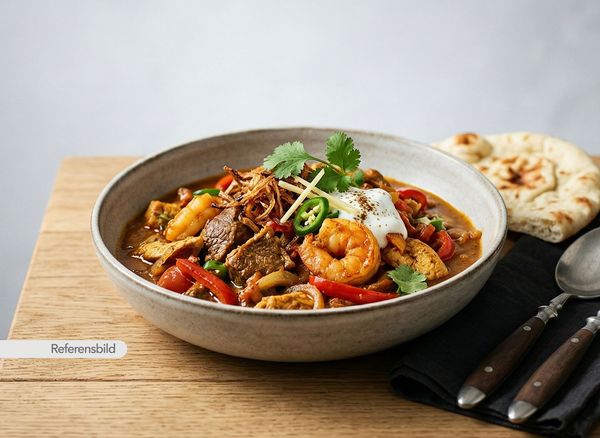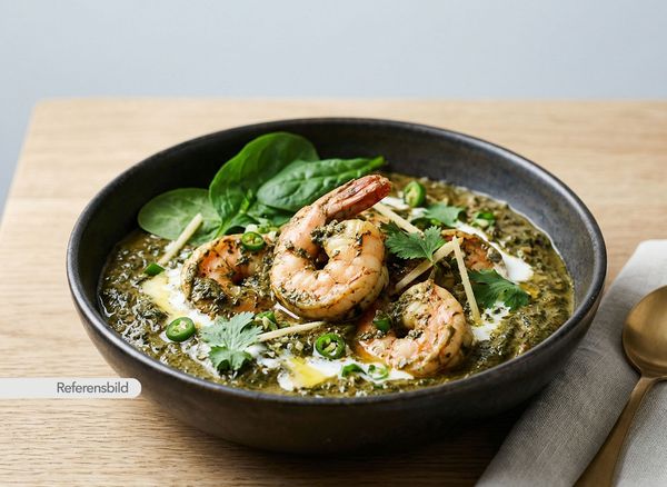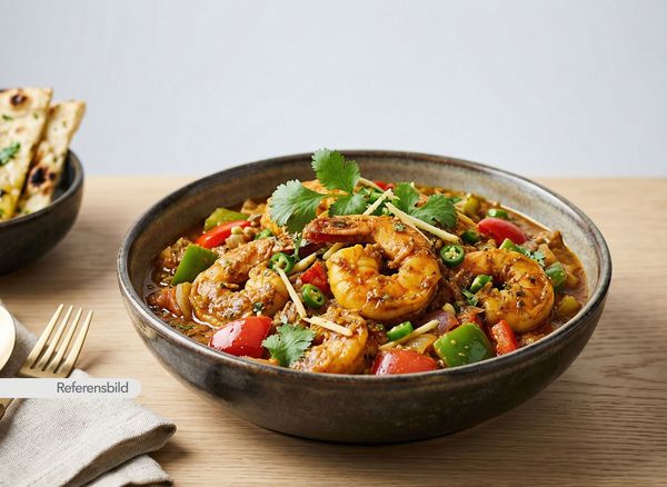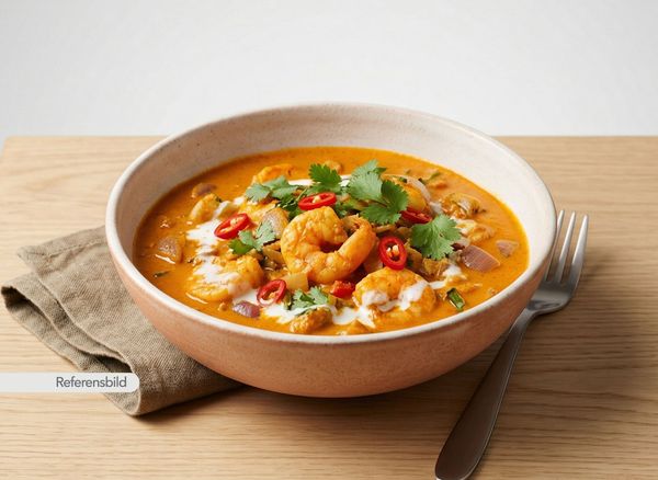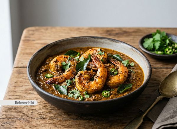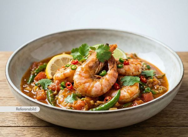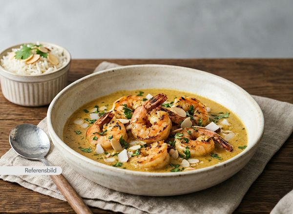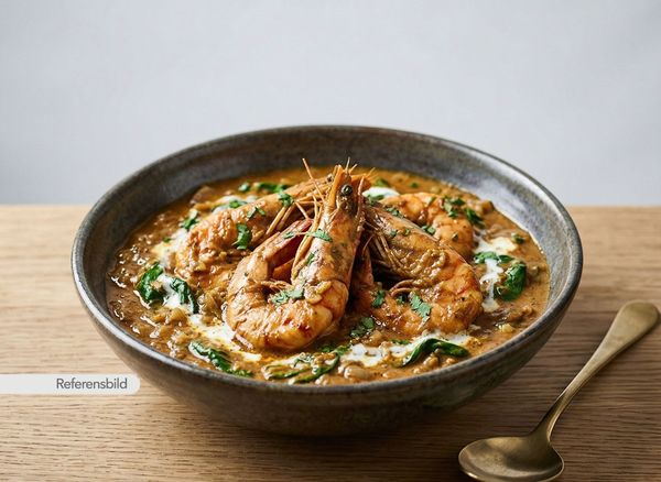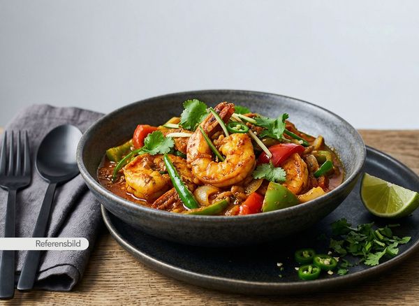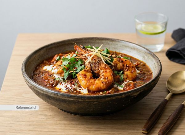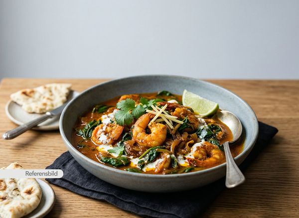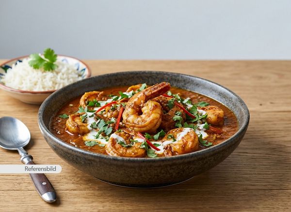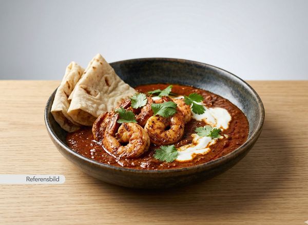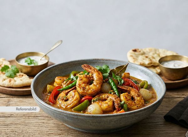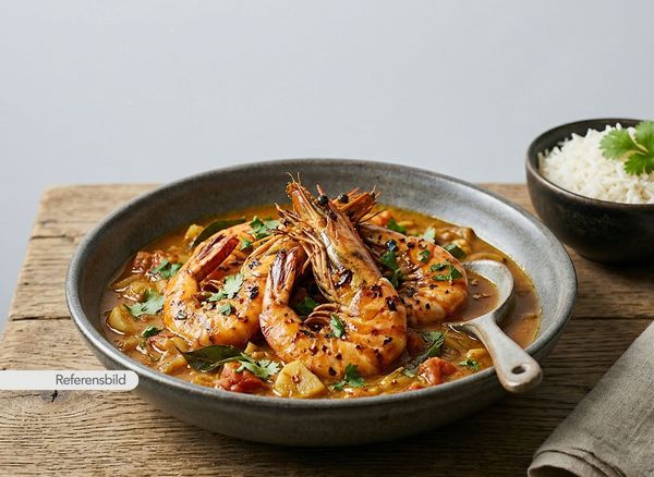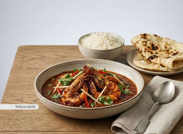 Stark. Serveras med jätteräkor, lök, vitlök, ingefära, chili, prawn-masala och kokosmjölk