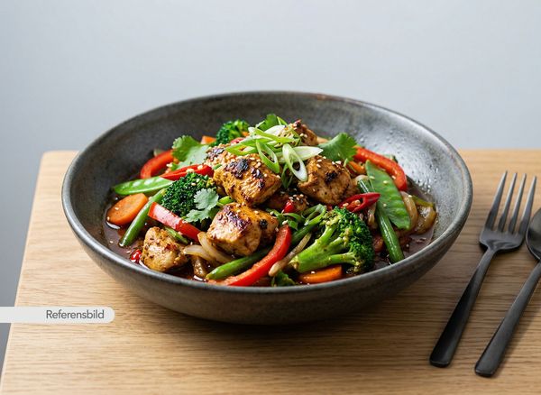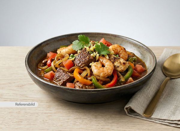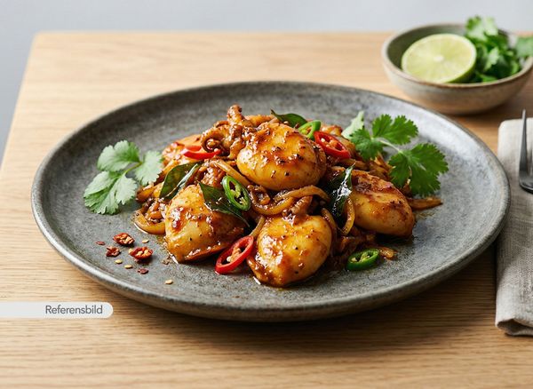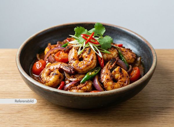 Stark. Serveras med räkor, lök, tomat, vitlök, ingefära, chili, sojasås och tomatsås