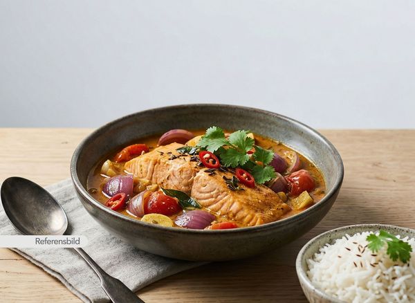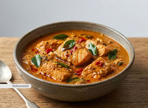 Stark. Serveras med laxfilé, lök, vitlök, ingefära, tomat, jaffna fish-masala och kokosmjölk