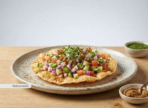 Serveras med friterad papadam toppad med hackad lök, grön chilli, tomat, gurka, koriander och Indiska kryddor