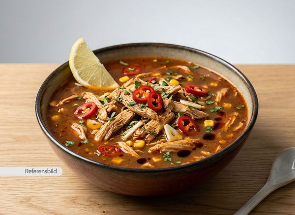 Serveras med stark kycklingsoppa med vitlök, chili, lemon, majsmjöl och sojasås