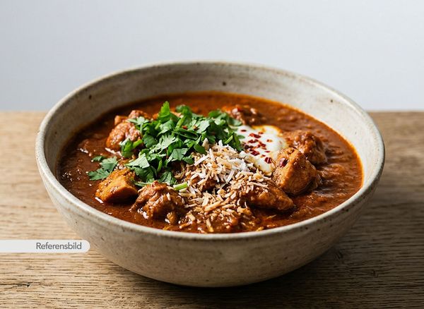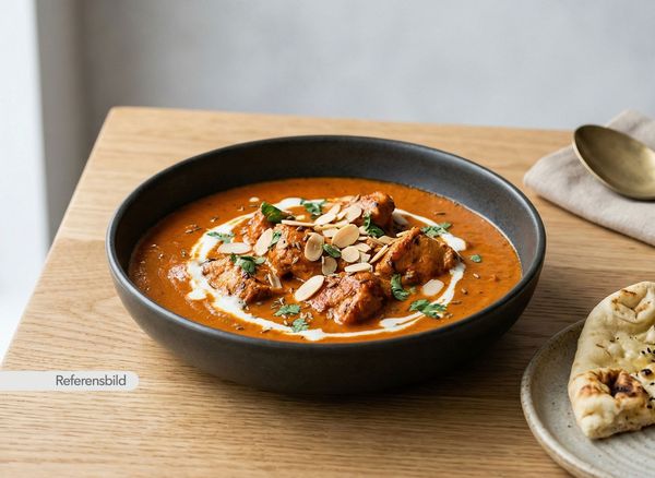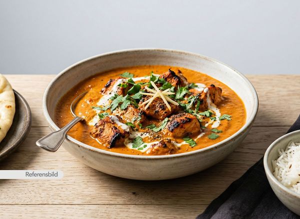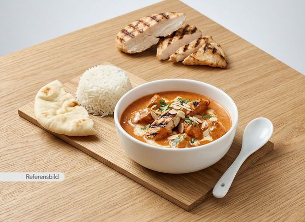 Mild och söt. Serveras med grillad kycklingfilé med tomatsås, Indiskt smör, kokos, mandel och grädde
