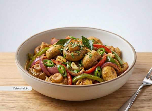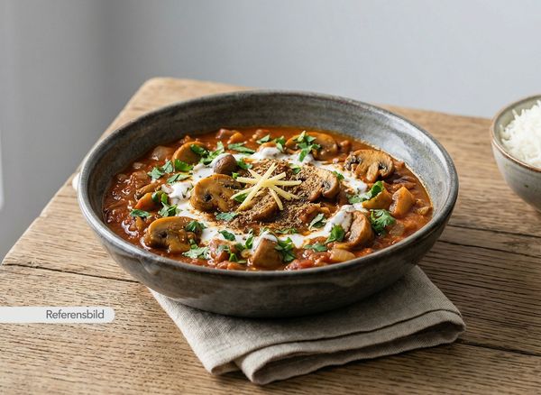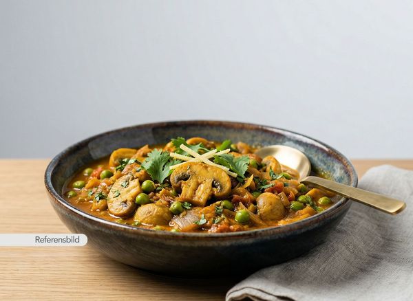Medium. Serveras med vegansk. Utsökt gryta med champinjoner, lök, tomat, ingefära, vitlök, Indiska kryddor och örter