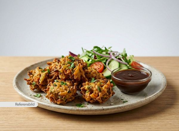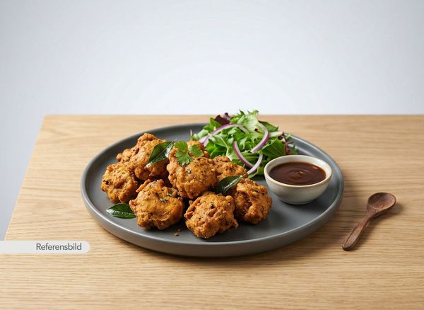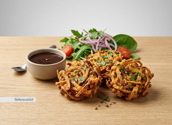 Medium. Friterade lökbullar med linser och färska kryddor. Serveras med sallad och tamarind chutney