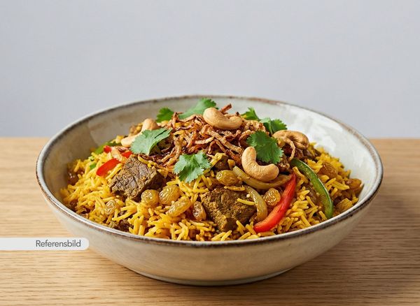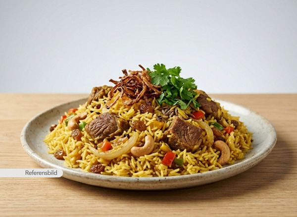 Medium. Serveras med smörstekt saffransris kokt ihop med kött, russin, lök, paprika, kryddor, rostad lök, koriander och cashewnötter
