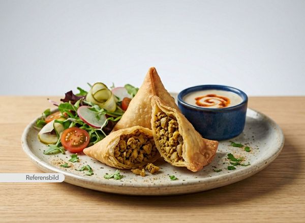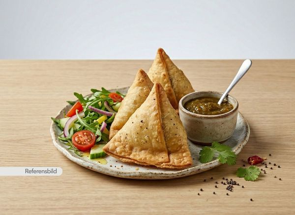 Medium. Indiska piroger med grönsaker. Serveras med sallad och fyllig sås
