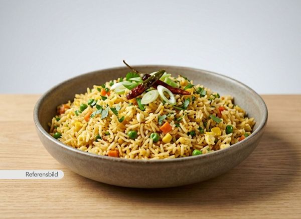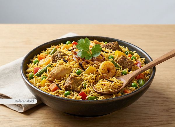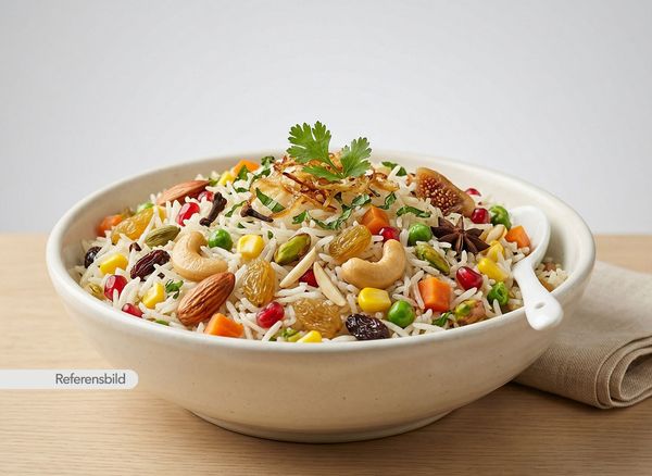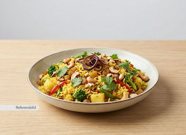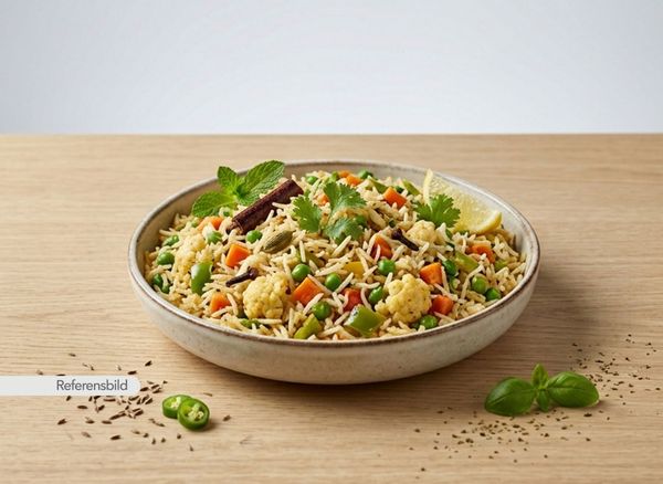 Serveras med basmatiris kokt ihop med blandade grönsaker, kryddor och örter
