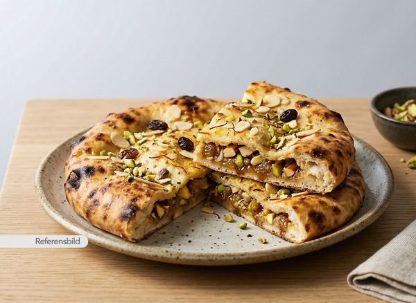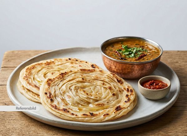 Serveras med ett tunnbröd i flera lager gjort av mjöl, salt, vatten och olja