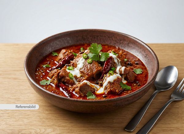 Stark. Serveras med mycket stark gryta tillagad med egen kryddblandning och specialsås