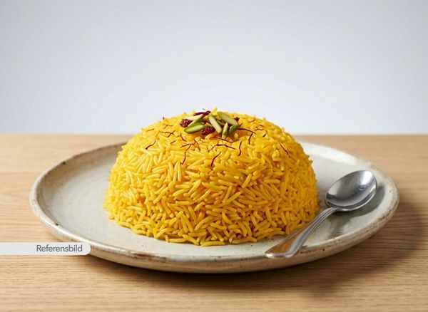 Serveras med basmatiris kokt med saffran