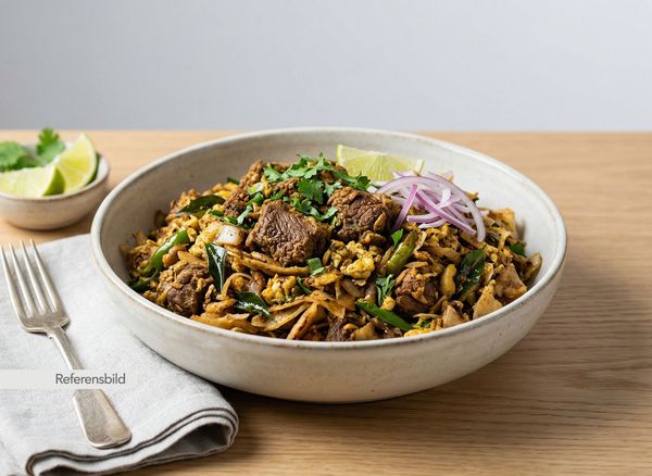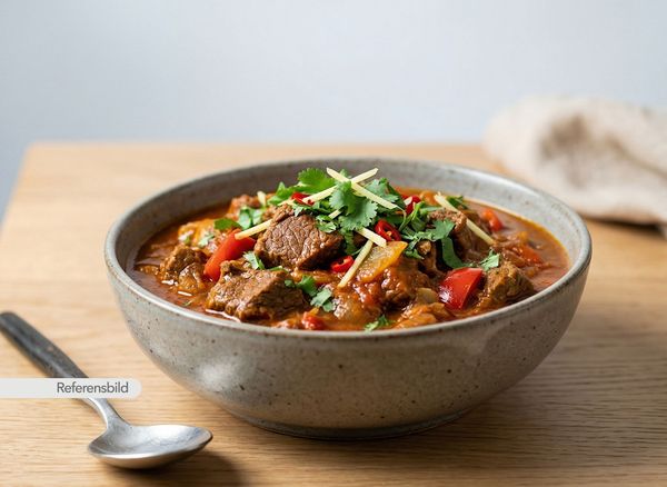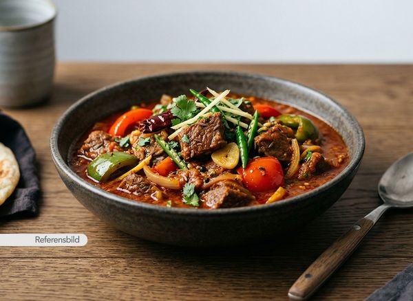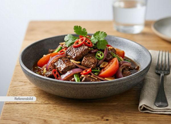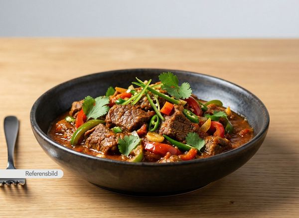 Stark. Serveras med biff, lök, tomat, vitlök, ingefära, chili, sojasås och vinäger