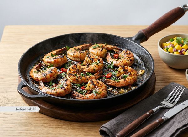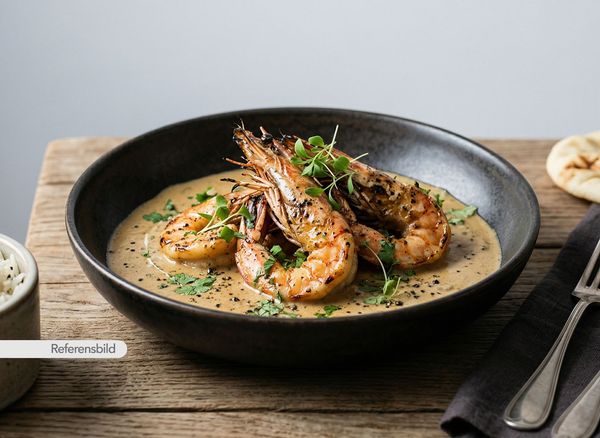 Serveras med marinerade och grillade jätteräkor