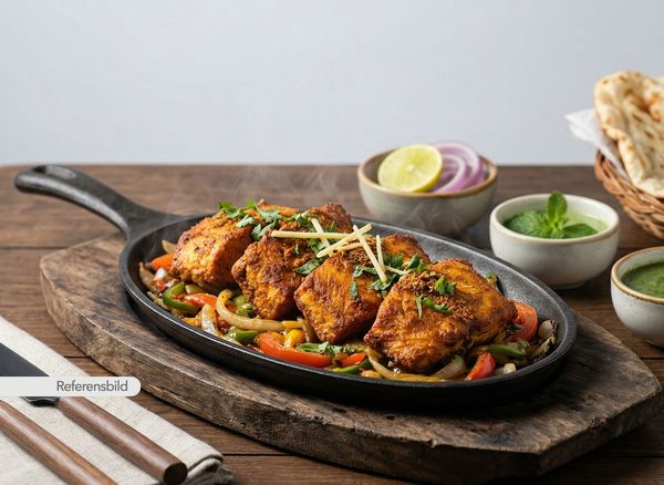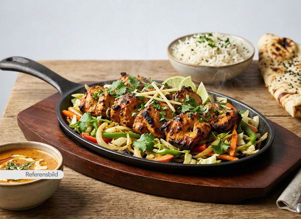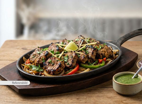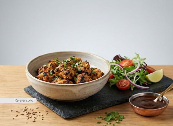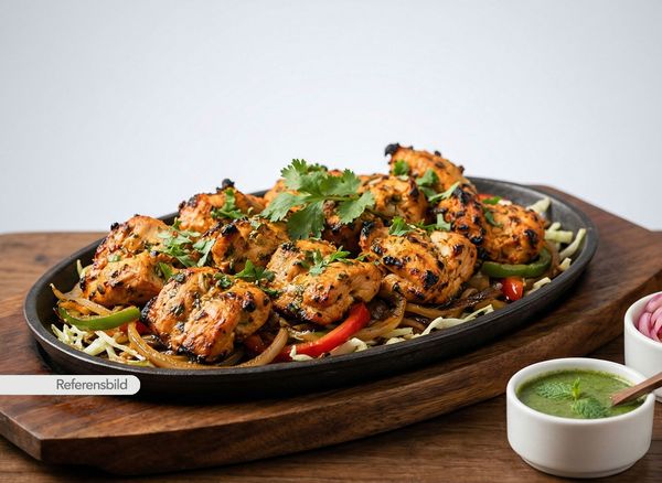 Medium. Kycklingfilé marinerade i masala och grillad i lerugn. Serveras med sallad och tamarind chutney