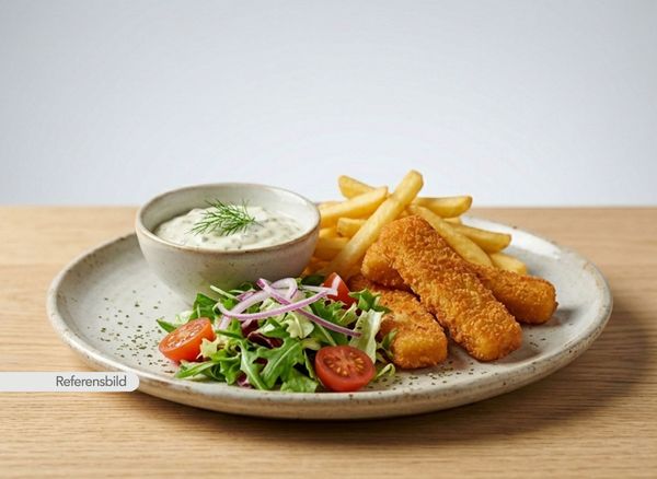Serveras med friterade fiskpinnar serveras med pommes, sallad och sås