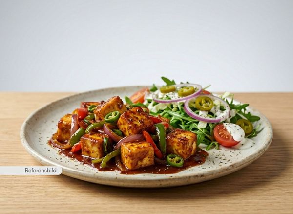 Serveras med hemlagad ost tillagad med färsk vitlök, lök, ingefära och paprika