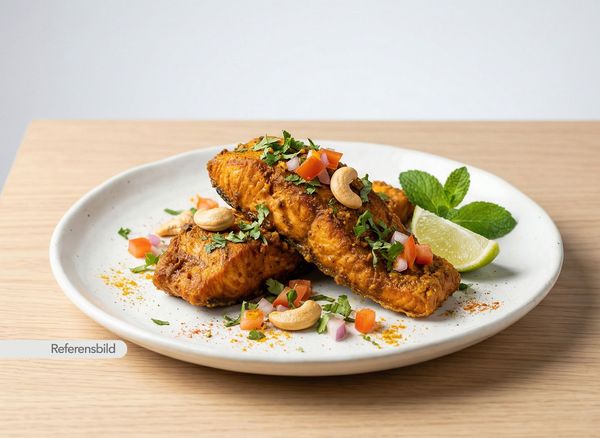 Medium. Serveras med friterad laxfilé marinerad med röd chili, gurkmeja, vitlök, ingefära, citronjuice, cashewnötter, lök, tomat och yoghurt