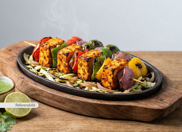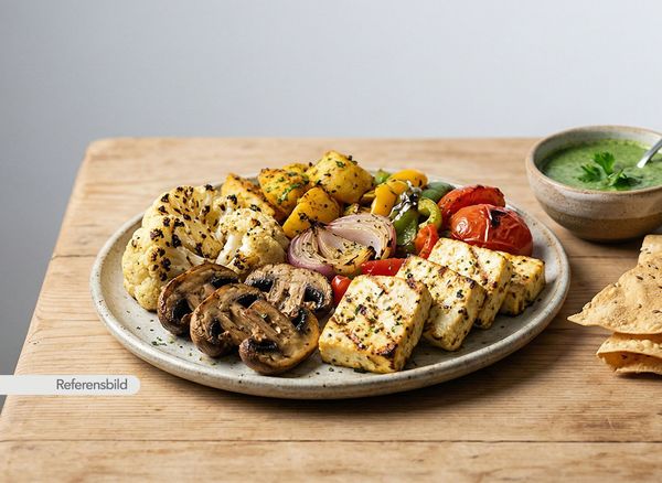 Grillade champinjoner, blomkål, potatis, lök, paprika, tomat och hemlagad ost. Serveras med dipsås och papadams