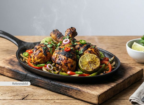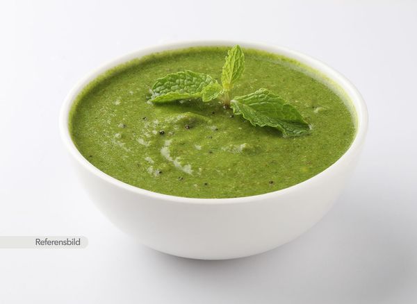 Stark. Serveras med gryta med färsk grön chili, paprika, koriander och vitlök som är tillagad i egen smakfull kryddsås