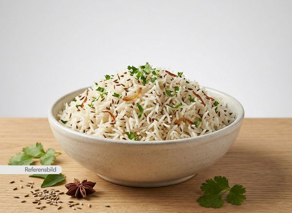Serveras med basmatiris kokt ihop med kummin, lök, koriander, kryddor och örter