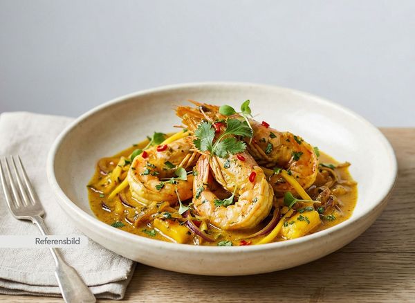 Serveras med cognac flamberad scampi med curry, mango, lök och kryddor
