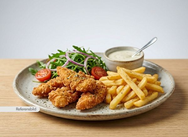 Serveras med friterade kycklingfilé bitar med pommes, sallad och sås