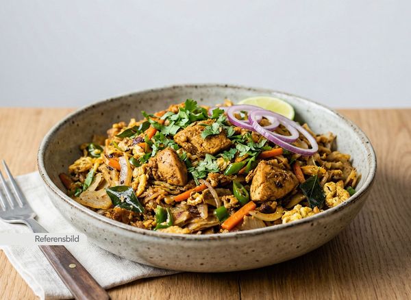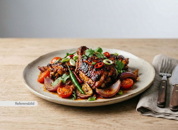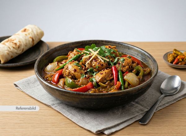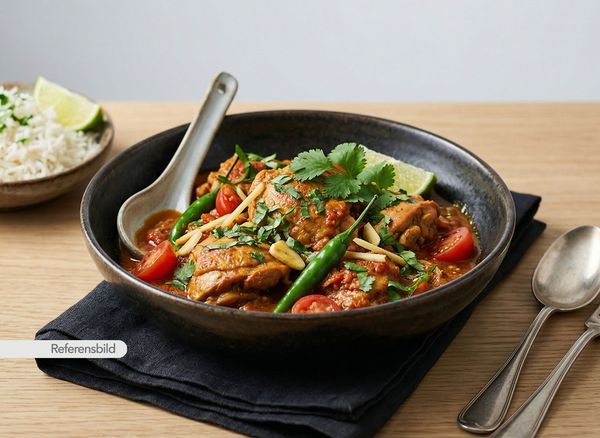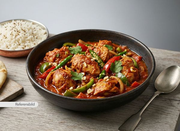 Stark. Serveras med kyckling, lök, tomat, vitlök, ingefära, chilli, sojasås och tomatsås