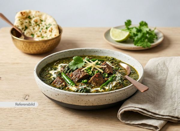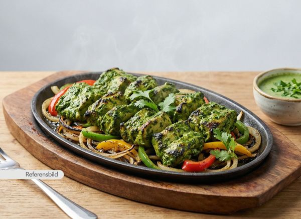 Stark. Serveras med kycklingfilé marinerad i spenat, koriander, mynta, grön chili, yoghurt, kryddor och örter