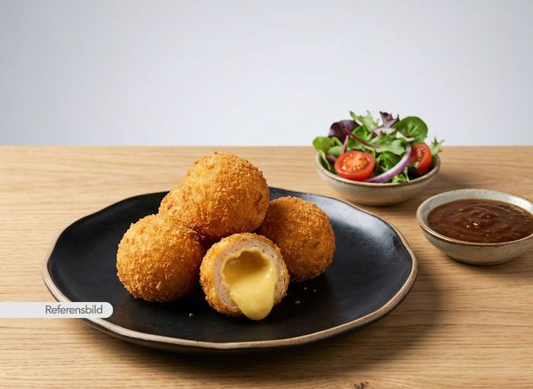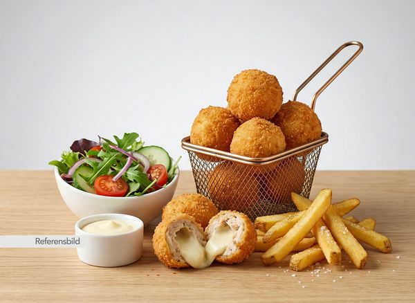 Serveras med friterade kyckling bollar fyllda med ost. Serveras med pommes, sallad och sås