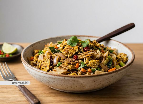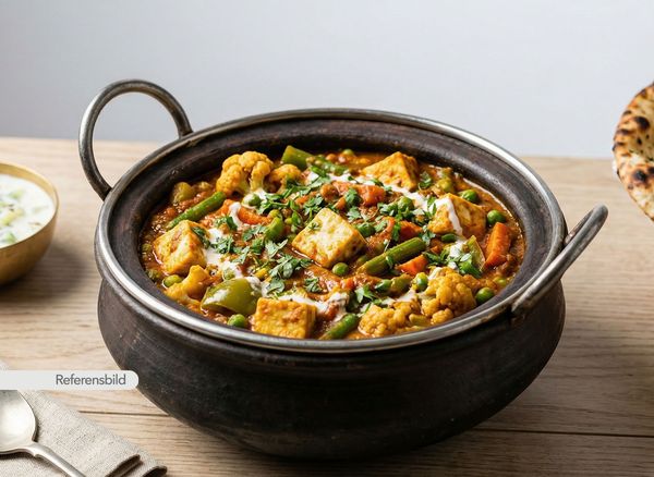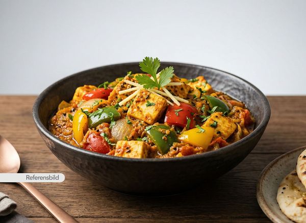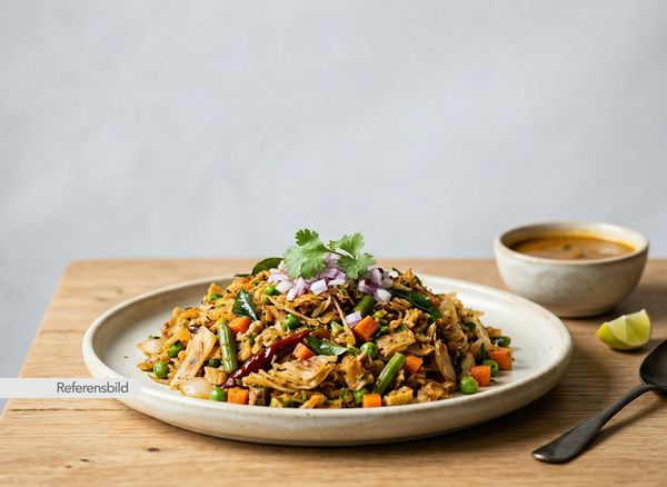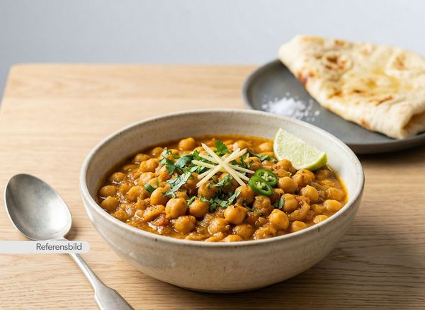 Vegansk. Serveras med kikärtor, lök, tomat, vitlök, ingefära och grön chili