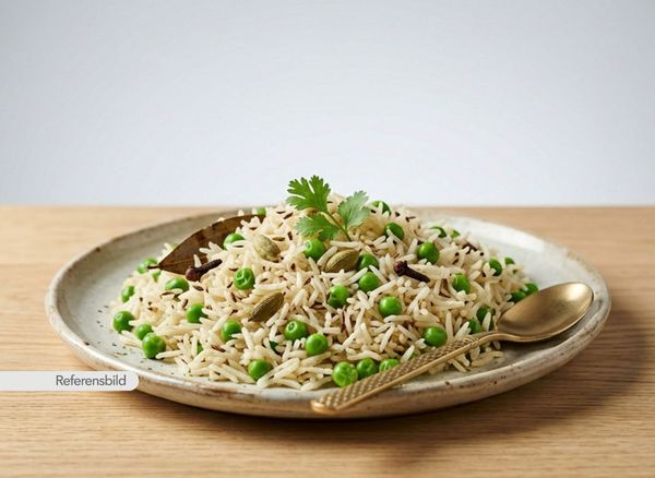Serveras med basmatiris, gröna ärtor, kryddor und örter