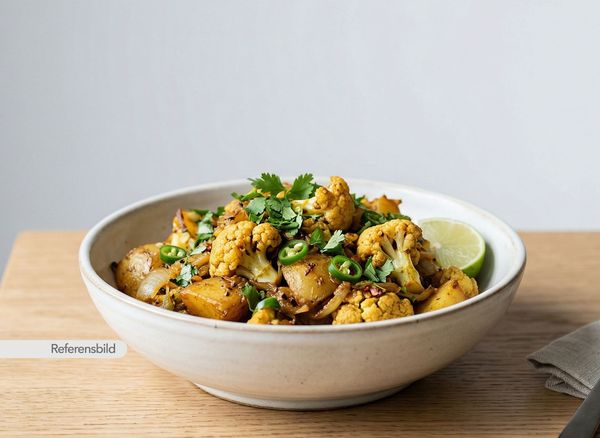 Vegansk. Serveras med potatis, blomkål, lök, koriander och grön chili