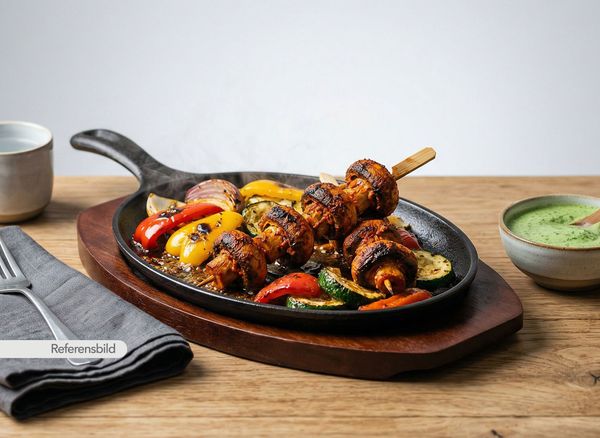 Färska champinjoner marinerade med tandoorisås och grillade i lerugn. Serveras med grillade grönsaker och dipsås