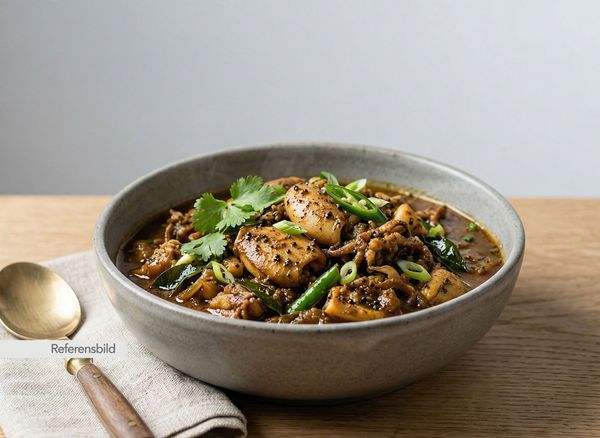Stark. Serveras med bläckfisk, lök, vitlök, ingefära, cuttlefish-masala, kokosmjölk och svartpeppar