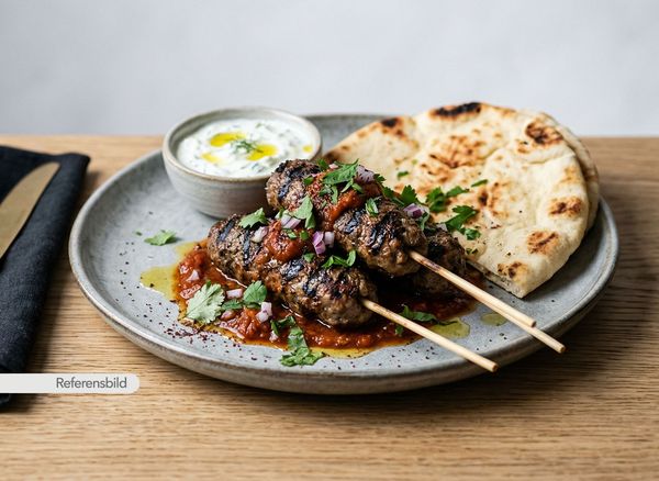 Serveras med hemmagjord lammfärskebab med lök, paprika, grädde, färska kryddor och tomatsås