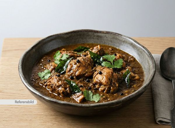 Stark. Serveras med handplockad chettinad masala-blandning, currysås med kokosmjölk, svartpeppar och curryblad