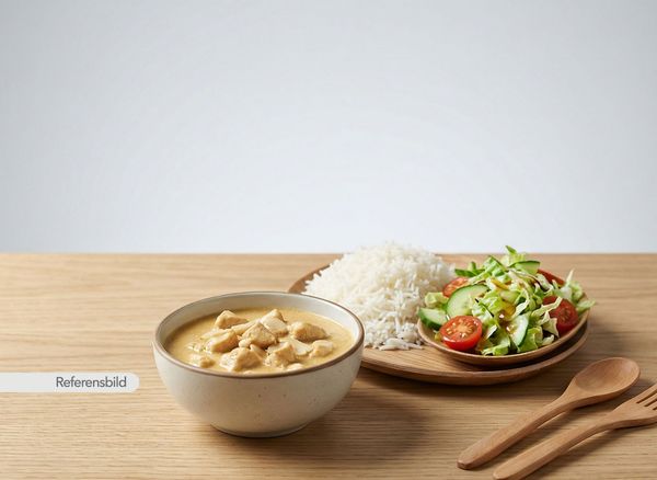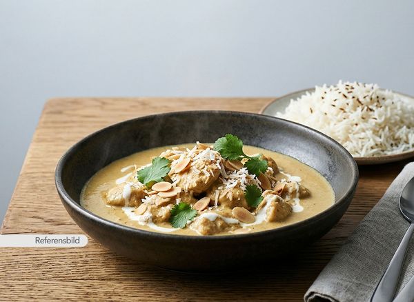 Mild kycklinggryta lagad med grädde, smör, kokos och mandel. Serveras med ris och sallad