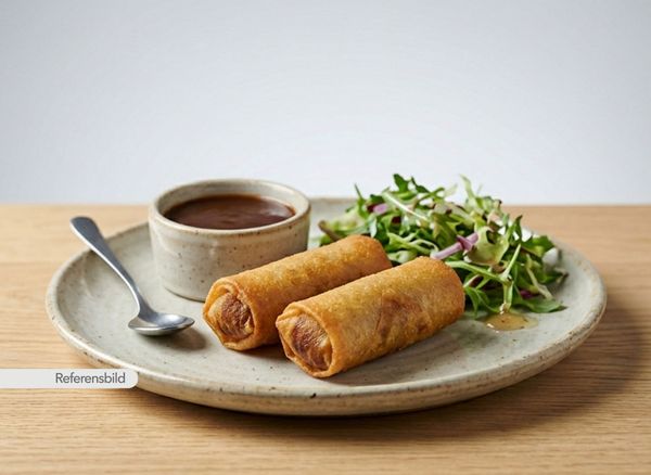 Medium. Lammfärs blandat med grönsaker som är rullat i rispapper och sedan friterat. Serveras med sallad och tamarind chutney