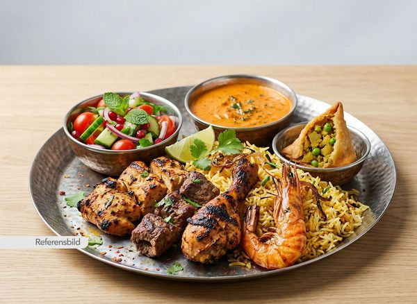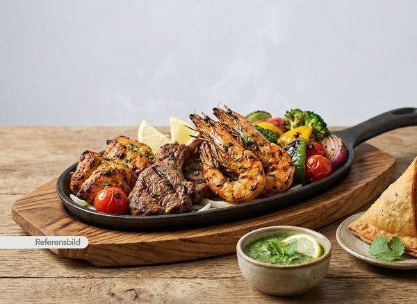 Serveras med lammfilé, kycklingfilé och jätteräkor marinerade i Indiska kryddor. Serveras med dippsås, samosa och grillade grönsaker