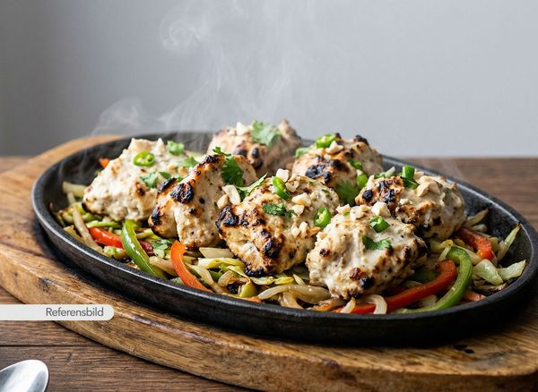 Serveras med grillad, marinerad kycklingfilé med grädde, ost, cashewnötter och kryddblandning