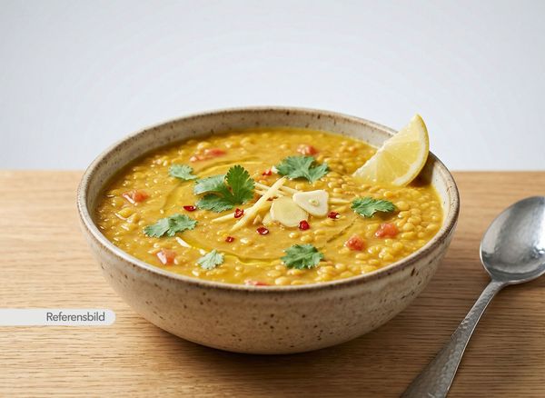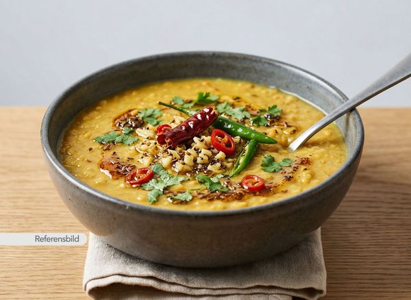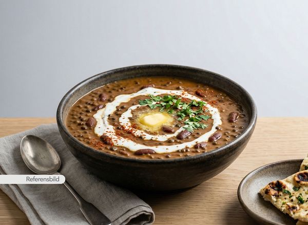 Vegansk. Serveras med linsgryta med färsk grön chili, koriander, vitlök, lök och ingefära